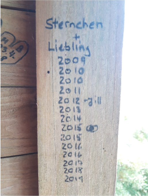 Vor über zehn Jahren hat eure Geschichte begonnen. Jedes Jahr seid ihr hier in dieser Schutzhütte gewesen, habt euch verewigt, manches Jahr sogar zweimal. Sorgsam, immer mit der gleichen Farbe habt ihr die Jahreszahl eures Besuches aufgemalt, damit er für alle sichtbar ist, nicht verblasst, eure Geschichte erzählt. Nur jetzt, dieses Jahr, bricht sie ab. Seid ihr umgezogen? Hat Corona euch einen Strich durch die Reihe gemacht?