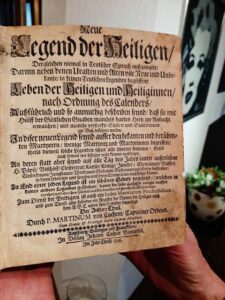 Tief im Süd­wes­ten der Repu­blik, kurz vor dem ers­ten Lock­down: Als ich mit Frei­bur­ger Freun­den deren Ver­wand­te nahe der Schwei­zer Gren­ze besu­che, fällt unser Blick auf ein altes Buch, das als Deko in der Die­le liegt. Als wir es öff­nen, stau­nen wir nicht schlecht. In Schnör­kel­schrift und einem die­ser end­lo­sen baro­cken Titel ist da zu lesen, dass es sich um Lebens­be­schrei­bun­gen von Hei­li­gen und Hei­ligin­nen han­delt. Dass in der Kir­che schon vor 300 Jah­ren gegen­dert wur­de, über­rascht selbst das buch­be­sit­zen­de Ehe­paar.